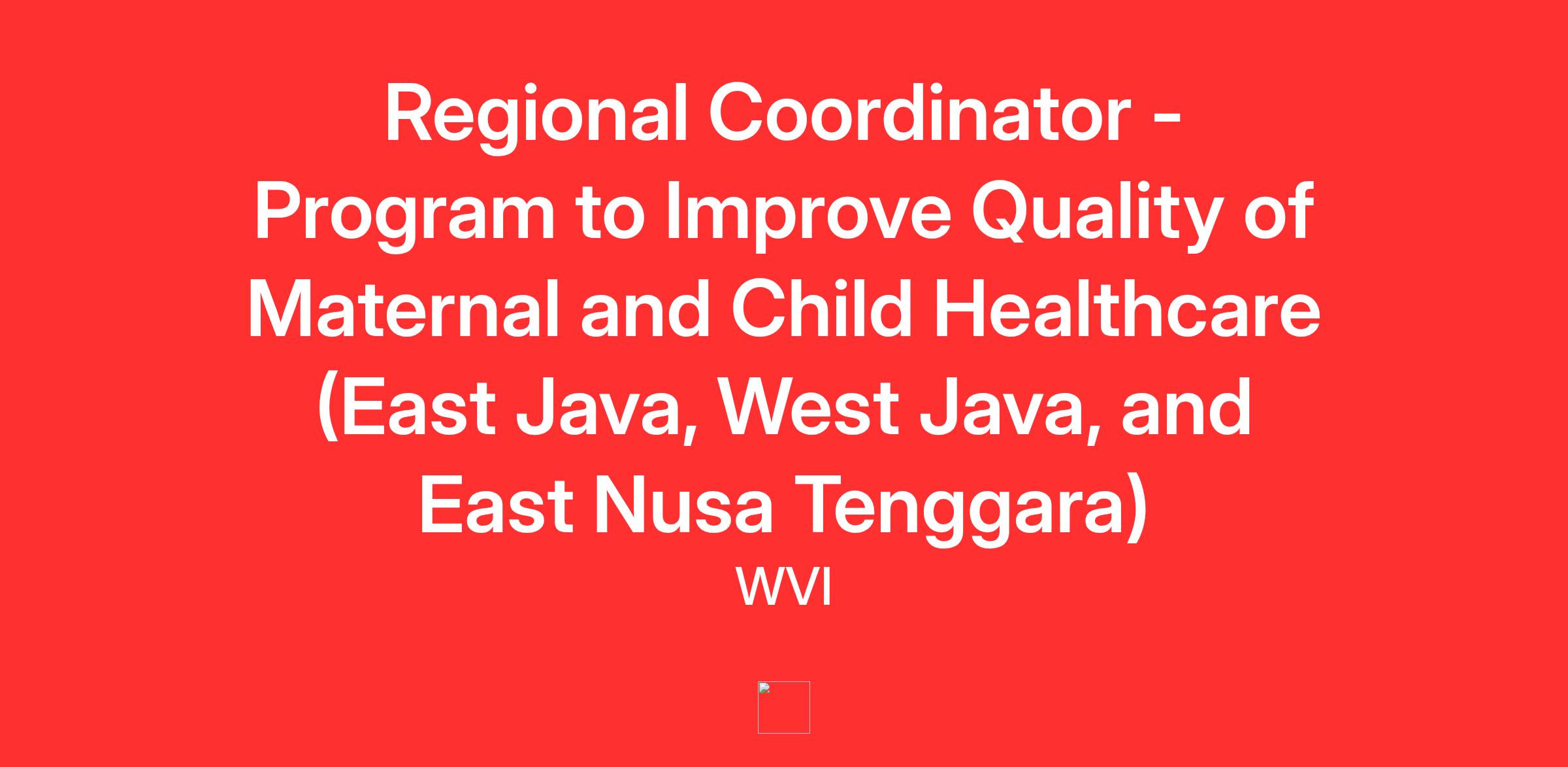Wahana Visi Indonesia is seeking five (5) Regional Coordinators, to oversee the program in 1) NTT: Kab. Kupang, Kota Kupang, and Timor Tengah Selatan; 2) NTT: Sumba Timur and Manggarai; 3) East Java: Jember and Pasuruan; 4) East Java: Sidoarjo and Jombang; 5) West Java: Bandung, Bogor and Garut. The Regional Coordinator position is responsible for supervising the community health work implemented by Community Health Officers on the ground, ranging from 7 to 15 Community Health Officers per Regional Coordinator. S/he will ensure completion of assigned tasks and quality of deliverables as will be reflected in the Community Health Officers' Completion of Work (CoW), by verifying the field personnel's means of verification (MoV), monitoring progress, support management and administrative needs and problem-solving at the regional level. S/he will also as act as key link between field teams and WVI national management and, where necessary, communication with lead partner/donor.